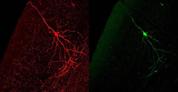 anti-GFP antibody (LEFT panel in RED) and autofluorescence (RIGHT panel in GREEN). In this case, the cortical neuron in this unfixed thick section was first photographed for GFP autofluorescence (LEFT), and then the section was fixed (4% paraformaldehyde) and immunostained for GFP-immunoreactivity (1:1000 dilution) using Texas Red-goat anti-chicken IgY antibodies as a secondary. The same cell (LEFT) was then identified.