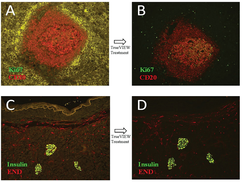 圖1. 顯著降低的自發(fā)熒光可揭示靶抗原的真正定位。上圖A、B為人脾臟(FFPE)組織染色結(jié)果: 使用anti-Ki67(綠色)和anti-CD20(紅色)。 (A)未經(jīng)任何處理;(B)經(jīng)TrueVIEW處理;上圖C、D為人胰腺組織染色結(jié)果:使用anti-Insulin(綠色)和anti-END(紅色)。(C)未經(jīng)任何處理;(D)經(jīng)TrueVIEW處理。