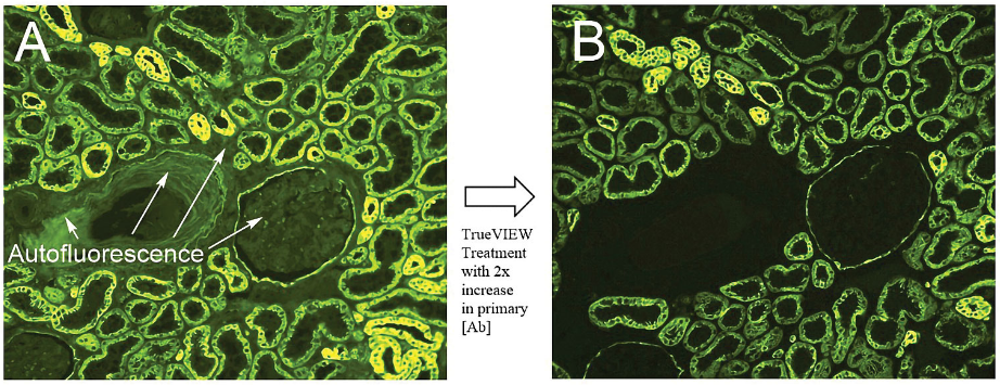 圖3.抗原修復(fù)的人腎臟(FFPE組織)染色結(jié)果:使用anti-AE1 / AE3(綠色)標(biāo)記。(A)未經(jīng)處理 (B)經(jīng)TrueVIEW處理。 一抗?jié)舛仍龃?倍可實(shí)現(xiàn)最佳的信噪比(圖B)。A圖中的箭頭部位代表B圖中去除的自發(fā)背景熒光。