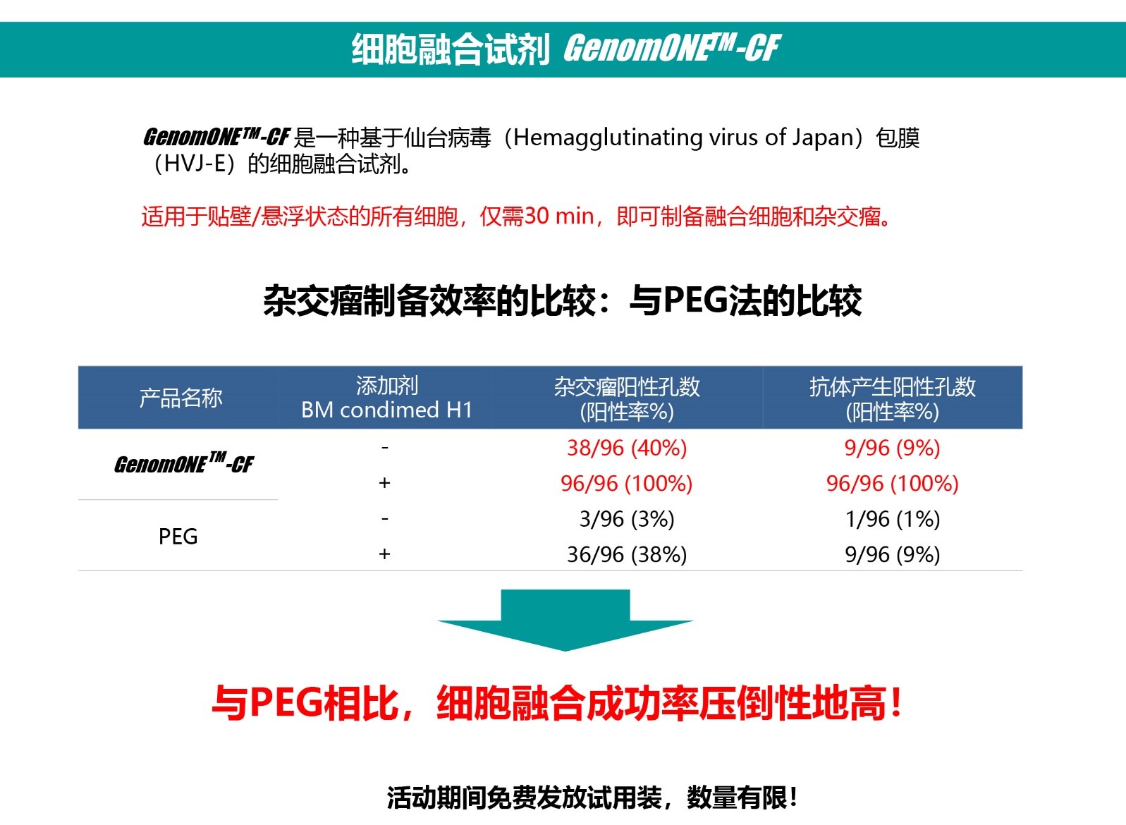 · 可替代電融合法、PEG法(與PEG法相比,本方法毒性更?。?